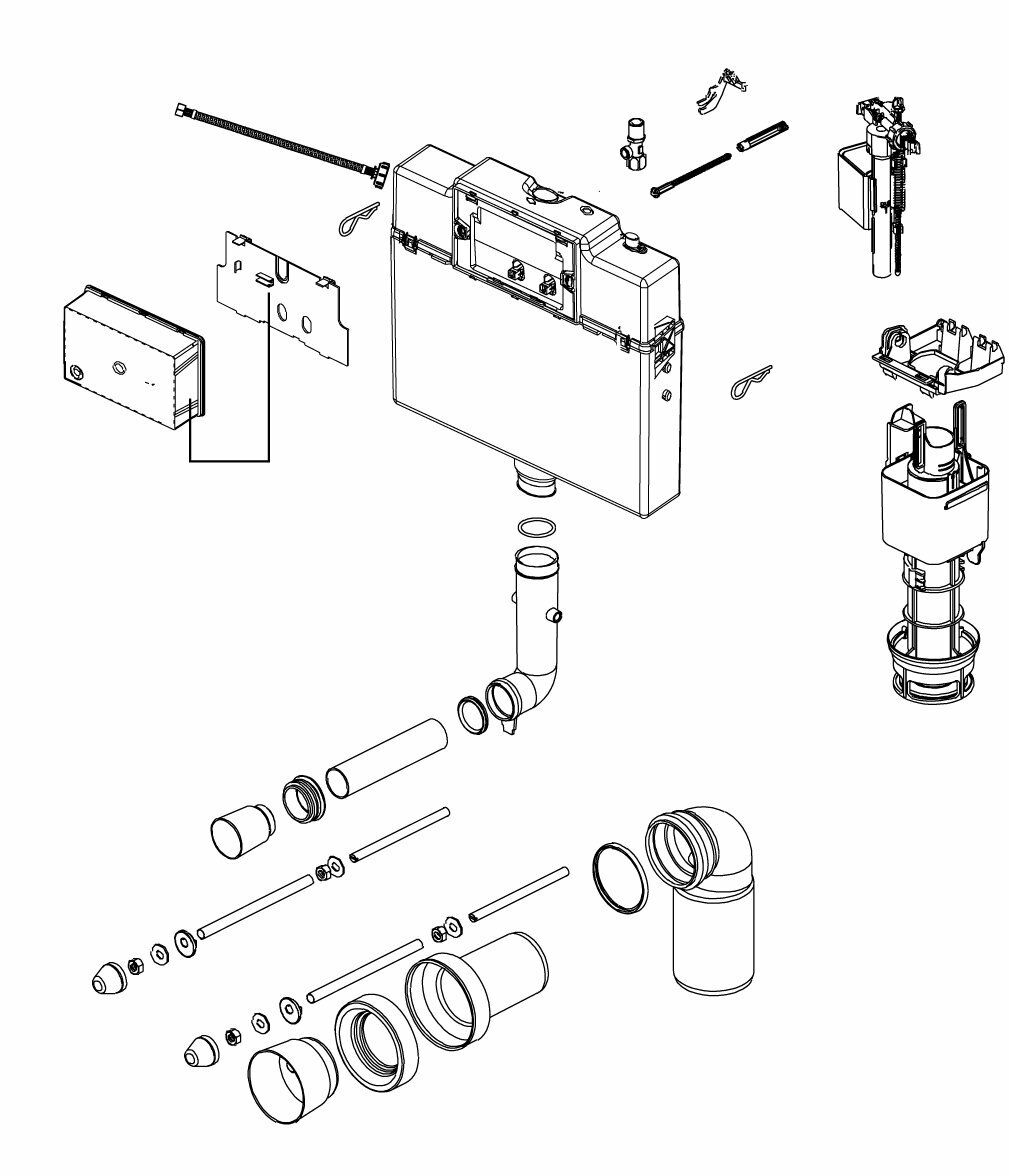 Na skici najdete najpogosteje iskane rezervne dele spodnjega podometnega splakovalnika. Če del, ki ga iščete, ni na voljo, nas kontaktirajte in poskusili vam bomo pomagati.